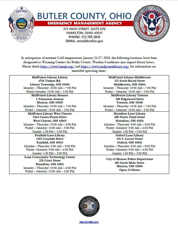 - Follow the Butler County EMA on Facebook for the most up to date information.